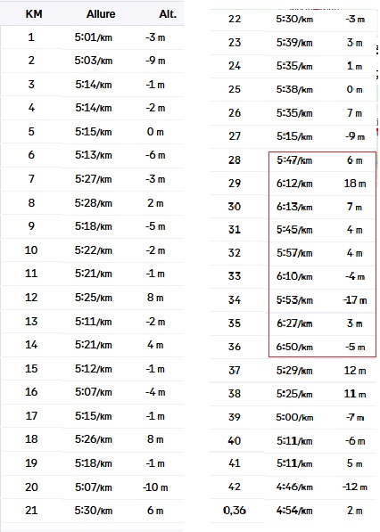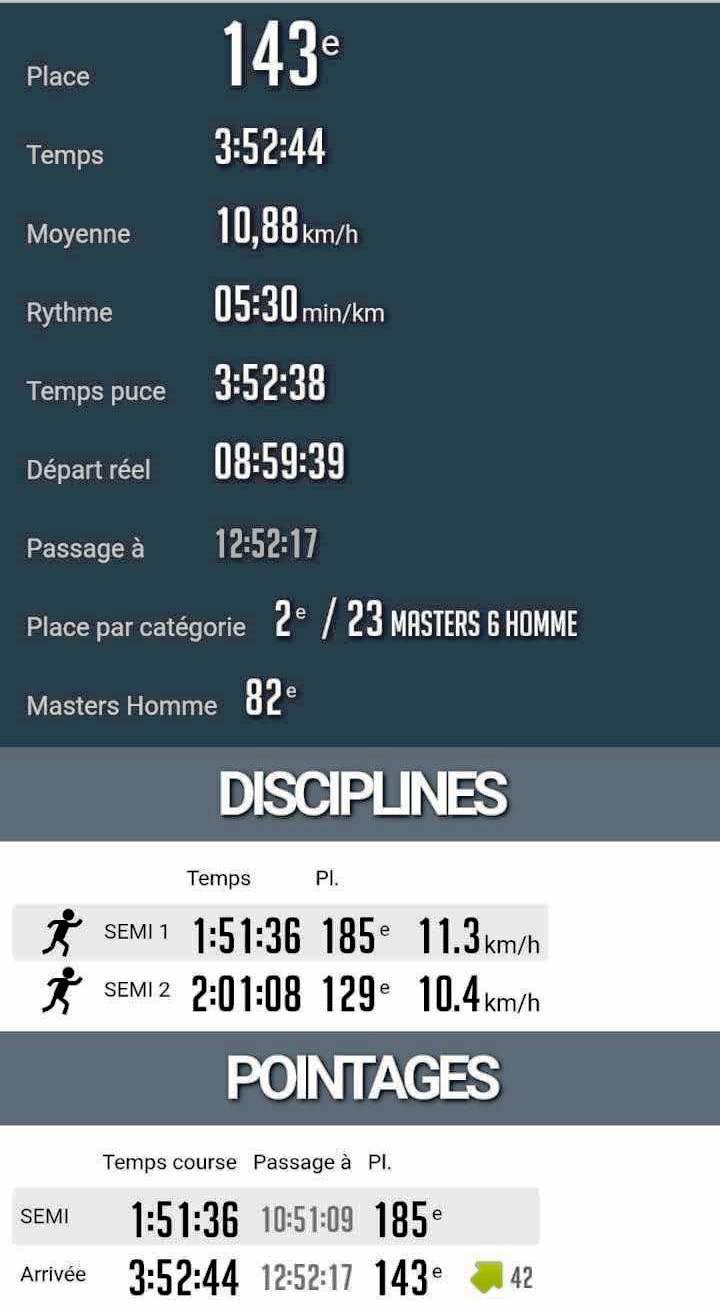 Au cas où, je rappelle que j'adore ces marathons festifs où chacun y trouve son compte. Personne ne gêne personne. Les premiers vont très vite ! D'autres mettent 6 heures... Perso je ne mange quasi rien du tout pendant un marathon (1 pâte de fruit et 2/3 petits morceaux de banane) je ne bois rien sauf s'il fait très chaud. Tous mes entr. de 30km ou + sont sans boire ni manger. Je n'ai pas faim et dès que je mange un peu plus que d'habitude, j'ai des douleurs très pénibles à l'estomac. |