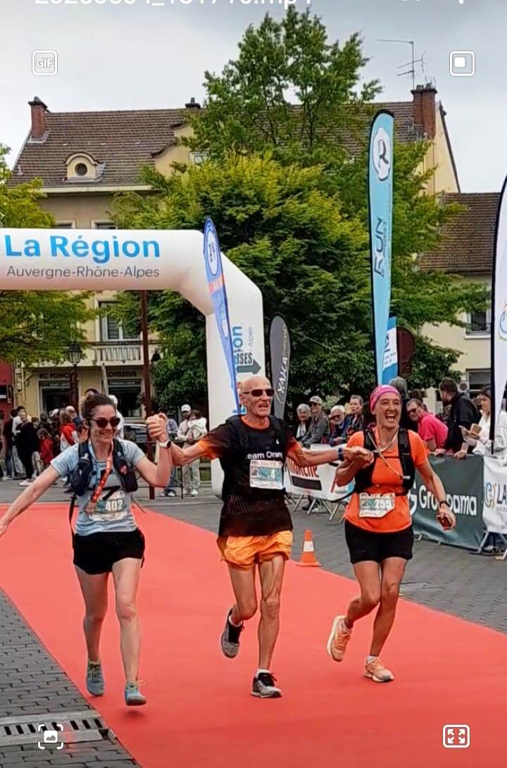 Quel grand plaisir de finir main dans la main avec 2 "supers Nanas" (inconnues de moi au départ) dont une m'a suivi depuis le départ et, l'autre après le 10eme km. Toutes les 2 espéraient moins de 4h15'... J'ai pris un grand plaisir à leur transmettre beaucoup de conseils (par ex. : se fatiguer le moins possible dans les côtes). A 1 km de l'arrivée, j'avais presque 2 min d'avance, je leur ai dit "foncez..." et j'ai attendu pour finir en 4h14'25". Et là... quelle surprise, elles ont toutes les 2 repassé en "arrière" la ligne d'arrivée pour avoir une photo avec moi sur le tapis rouge ! Elles finissent en moins de 4h12' ! Elles m'ont bien remercié, mais c'est moi qui les remercie aussi beaucoup pour ce grand moment qui est gravé pour longtemps dans ma mémoire et peut-être un jour dans un prochain livre ! (PS : il y avait une dizaine d'autres coureurs/ses avec nous mais seulement ces 2 qui ont tenu jusqu'au bout) Après quelques km Robin de mon club en Drôme fait un selfi de nous 2 en courant. Et je discute souvent avec Stéphane qui, par manque d'entraînement ne pourra pas suivre après le 1er semi. |