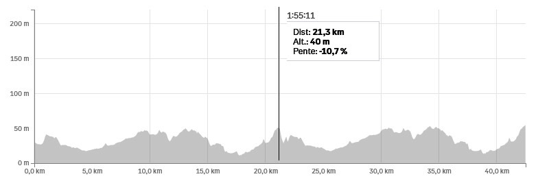 Un parcours de 21 km avec de nombreuses côtes à grimper 2 fois pour le marathon. 2h06' pour le 2eme semi ! Record battu !