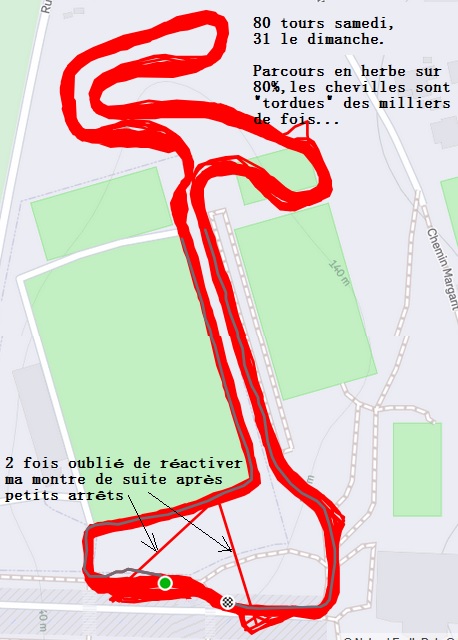 6'48" par km en moyenne totale sur les 80 km le samedi, un peu plus le dimanche pour les 31. Environ 4 m. de D+ à chaque tour. Soit 450 D+ en tout |