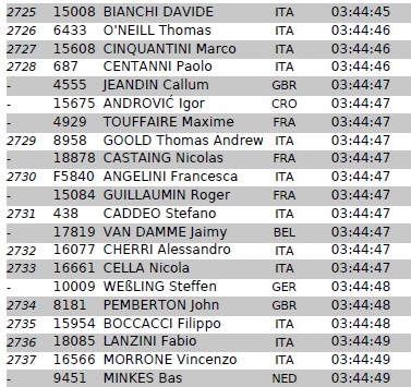 Bizarre : seuls/es les coureurs/ses italiens et les étrangers qui ont payé une licence italienne sont comptabilisés ! Sur ce classement, je suis donc 2731eme sur env. 9500 classés mais 5910ème sur la totalité sur le nombre total de partants : entre 25000 et 30000 ??? |