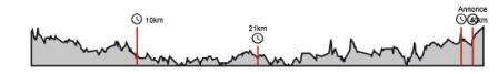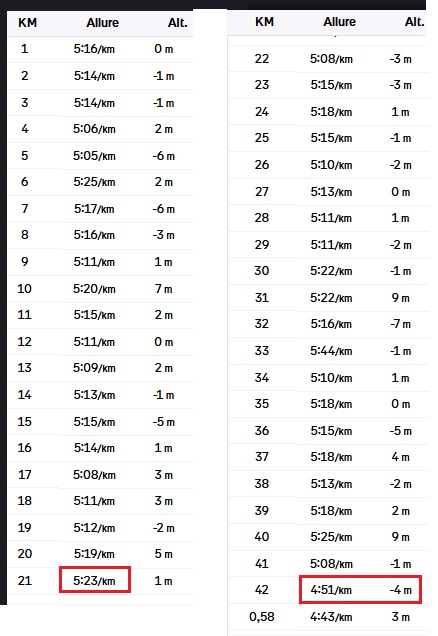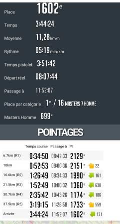 Difficile de croire que j'ai gagné 630 places entre les km 16,6 et 21,5 ! Seulement en 5 km ??? Allure très régulière à 5'15"/km sauf arrêt de 2' non volontaire, enfin forcé (!) au 32eme km