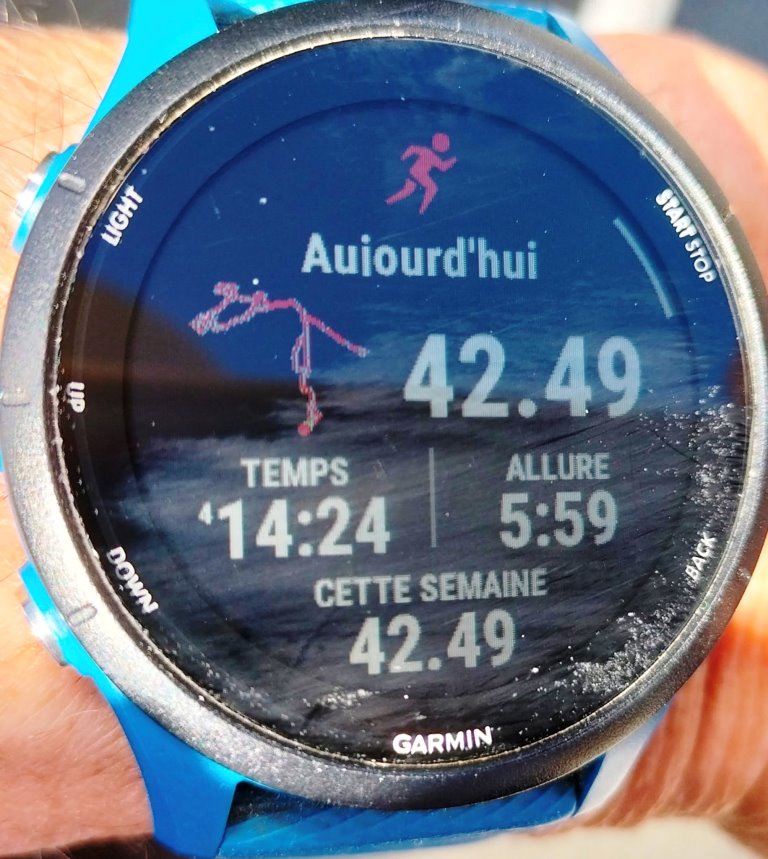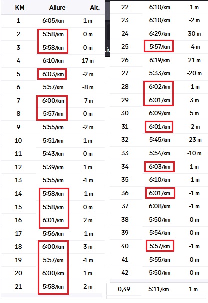 19 km à 6'/km +/- 3 sec. Evidemment on compense l'allure en côte par un peu plus de rapidité en descente.