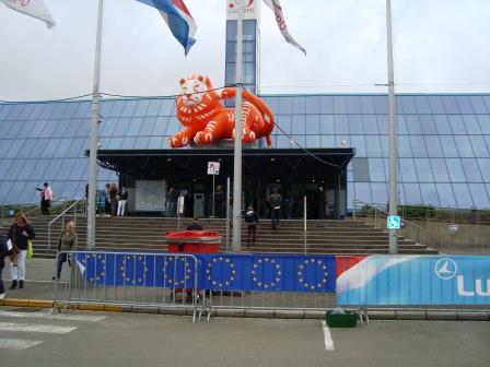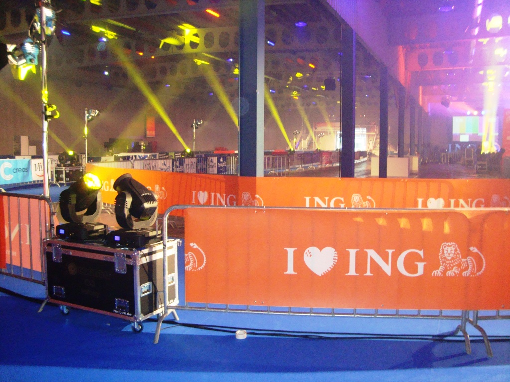 Je vais chercher mon dossard le vendredi à Luxexpo vers 19h. L'immense hall est partagé entre différentes utilités. On voit de suite où aura lieu l'arrivée, puis là où on laissera nos sacs, et plus loin, la pasta-party. On repère le départ des navettes car demain la voiture restera au parking relais. Tout est très bien organisé et on attend que très peu pour avoir des pâtes dans un grand verre. Une grande ambiance règne déjà, les projecteurs tournent et illuminent le plafond. |